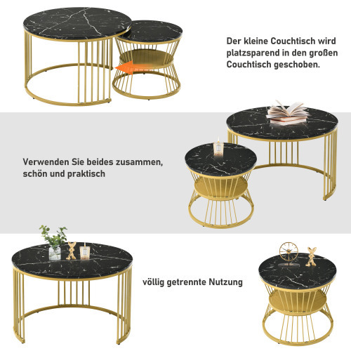 [SOLID UND DAUERHAFT]Hergestellt aus starkem Metall und verdickten MDF-Materialien, ist dieser Wohnzimmertisch sehr innovativ und modisch, ziemlich langlebig für lange Zeit zu Hause zu verwenden. Das Design der runden Platte verbunden mit den Metallbeinen kann die maximale Stabilität des Couchtisches gewährleisten. [SMART & EINZIGARTIGES DESIGN]Das moderne runde Couchtisch-Set umfasst 2 kleine Tische, und die Nesting-Kombination ermöglicht es Ihnen, sie leicht zusammenzustecken oder separat zu verwenden. Kompakte Größe und leicht, einfach zu bewegen und zu tragen. Sie können diese Beistelltische einzeln im Raum verteilen oder sie für leicht zugänglichen Kaffee und Snacks ineinander stecken. Perfekt für Wohnzimmer, Schlafzimmer, Balkon, kleine Räume, etc. [SAFETY DESIGN]Kreisförmiges Design ohne Tischecken, vermeiden Sie unnötige Stöße verletzt .Dieser Tisch ist mit Non-Marring Bodenmatten entworfen, um Böden vor Kratzern, Eindrücken und anderen möglichen Schäden zu schützen. [SMALL COFFEE TABLE]Dieser Couchtisch ist mit einer Größe von 70*70*47cm / 45*45*40cm entworfen, ideal für kleine Räume. Leicht, aber stabil. Flexibel genug, um sich zu bewegen. Wenn Sie in einer Einzimmerwohnung oder einem Wohnheim leben, ist dieser Couchtisch eine gute Wahl. NESTING DESIGN FOR SPACE SAVING: Dieses Set von runden Couchtischen kann individuell für verschiedene Zwecke verwendet werden, wie Lampentisch, Beistelltisch, Nachttisch. Oder wir können diese zwei kleinen runden Couchtische zusammen stapeln, um Platz zu sparen und ein raffiniertes Design zu erhalten. STURMBARE STRUKTUR FÜR STABILITÄT UND HALTBARKEIT: Mit dem robusten Metallrahmen in Goldoptik können diese funktionalen Tische eine Tragfähigkeit von bis zu 30 kg erreichen. EINFACH ZU MONTIEREN: Mit unserer klaren Montageanleitung wird es für jeden einfach sein, dieses 2er-Set von Beistelltischen zusammenzubauen. Alle Teile und die Montageanleitung werden mitgeliefert.